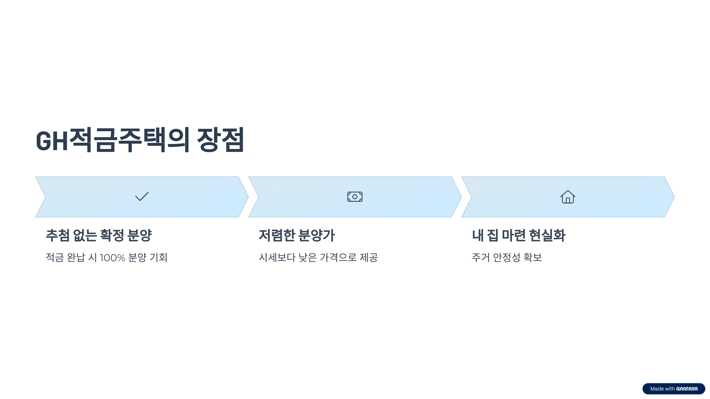 무엇보다도 GH적금주택의 가장 큰 장점은 우선공급이 확정된다는 점입니다. 성실히 적금을 유지한 가입자에게는 추첨이 아닌 확정 방식으로 공급되어 내 집 마련의 꿈을 더욱 현실적으로 만들어 줍니다. 정부와 공공기관의 협력으로 운영되는 이 제도는 안정성과 실효성을 모두 갖추고 있어 장기적인 주거 대책으로도 충분히 검토해볼 가치가 있습니다.