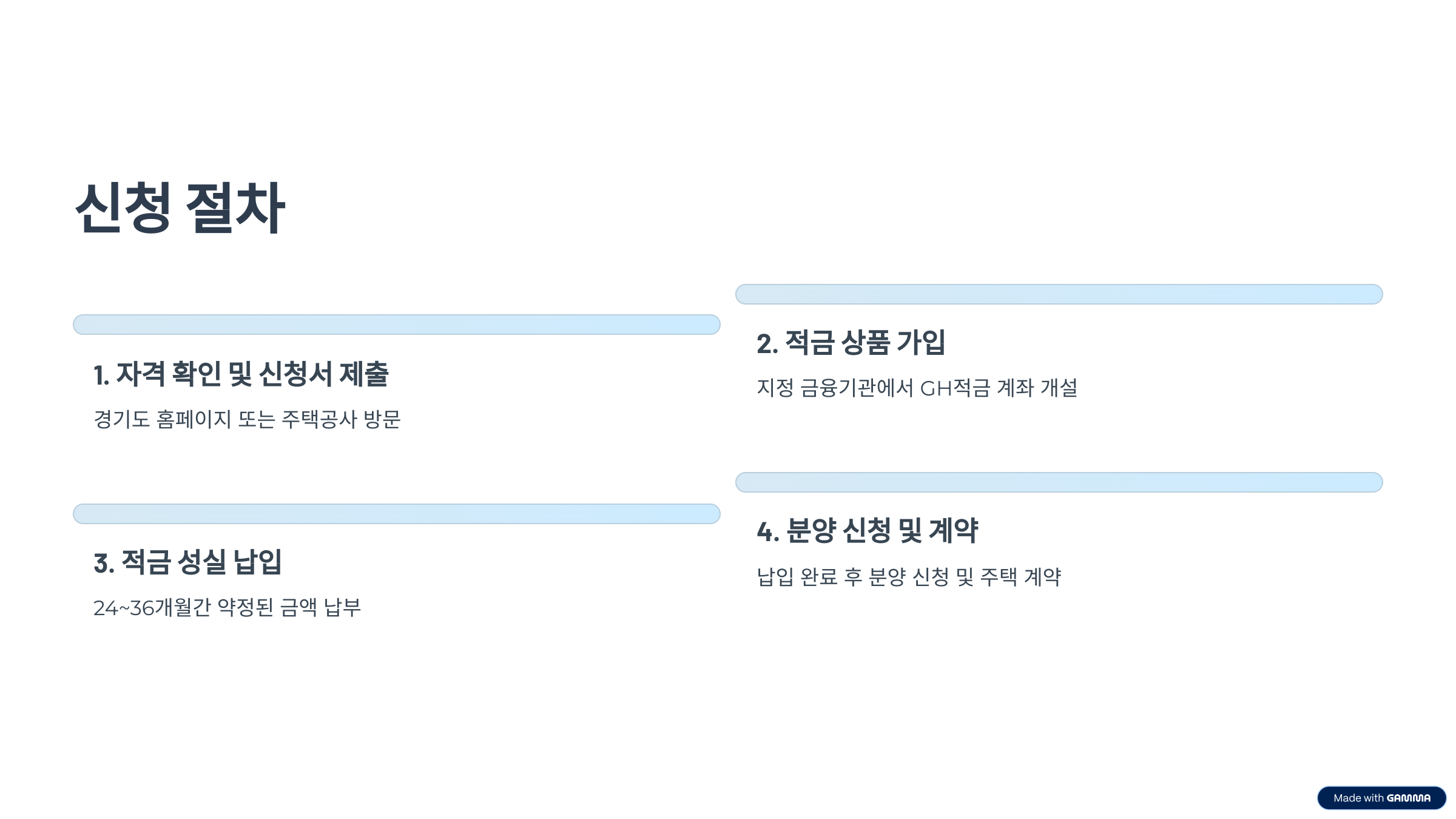| GH공사와 금융기관 협력 운영 | 납입기간 24~36개월, 중도해지 시 자격 상실 | 적금 유지 후 분양공고에 따라 신청 가능 |