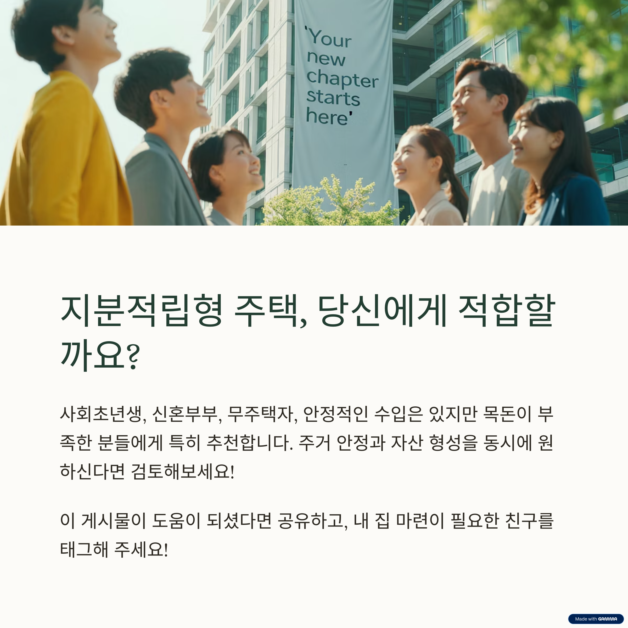 지분적립형 분양주택은 단순한 부동산 공급을 넘어서 내 집 마련의 진입 장벽을 낮추는 혁신적 제도입니다. 초기 자금 부족으로 집을 포기했던 이들에게 실질적인 소유 기회를 제공하며, 장기적 자산 형성까지 지원합니다. 제도 취지를 잘 이해하고, 본인의 상황에 맞는 전략을 세운다면 미래를 위한 확실한 발판이 되어줄 것입니다.