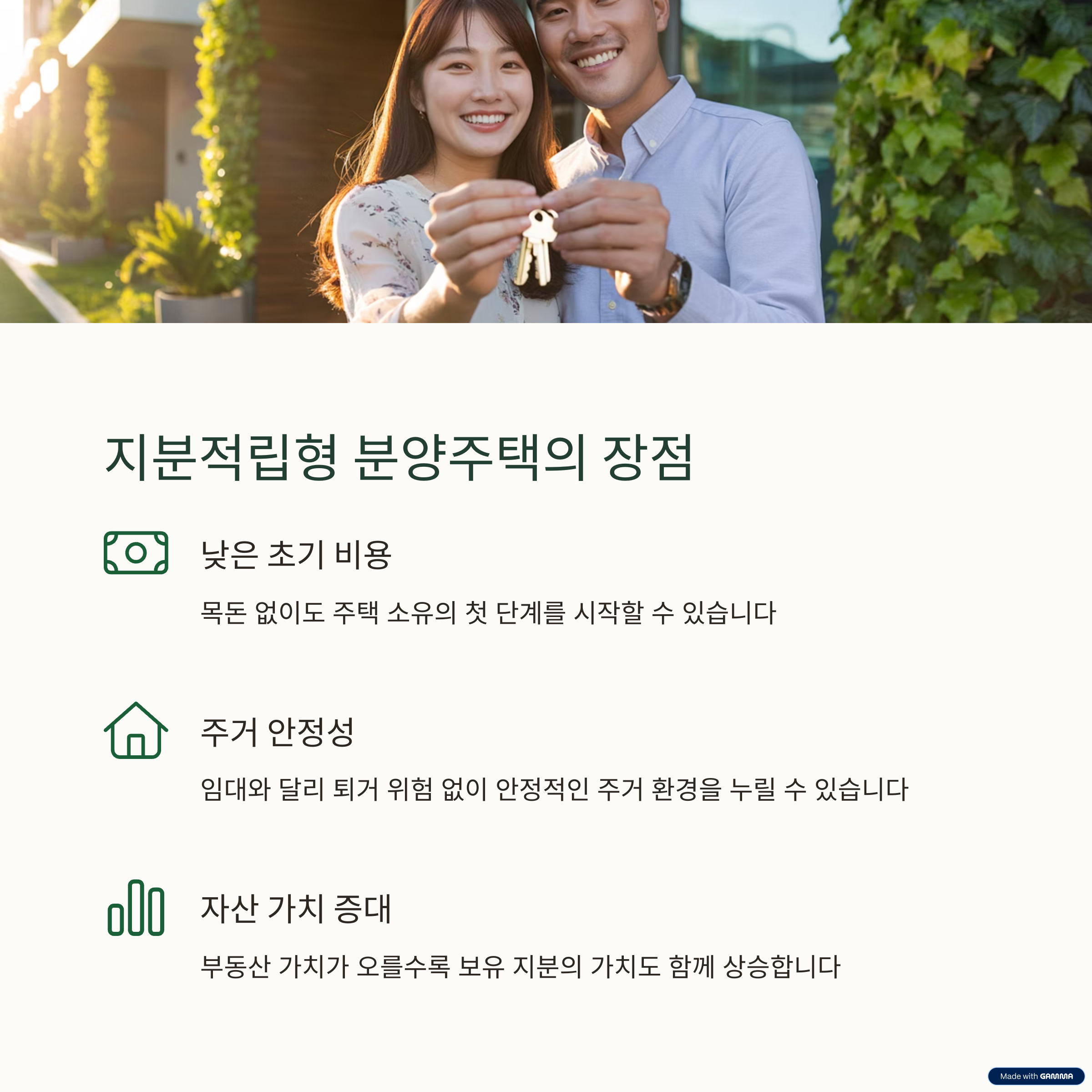특히 청년층과 신혼부부처럼 목돈을 마련하기 어려운 계층에게 유리합니다. 임대 개념과는 달리 실제 지분을 구매하는 구조라, 초기 자본 없이도 집값 상승의 혜택을 누릴 수 있습니다. 또한 정부와 지자체가 주도적으로 공급을 확대하고 있어 안정성과 제도적 신뢰도도 높습니다.