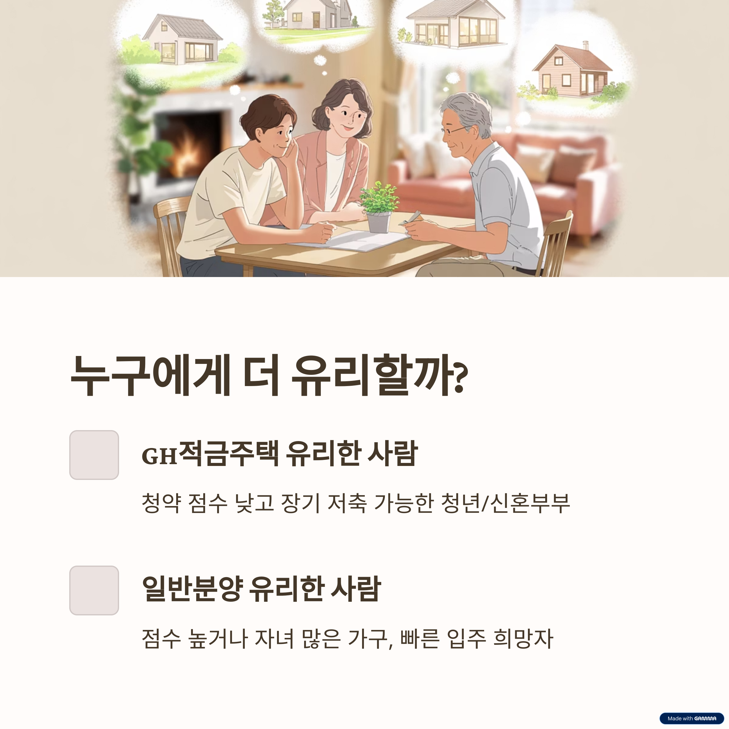 GH적금주택과 일반분양, 여러분이라면 어떤 선택을 하시겠나요? 댓글로 의견을 남겨주세요! 다양한 경험과 시선이 더 좋은 정보를 만듭니다.