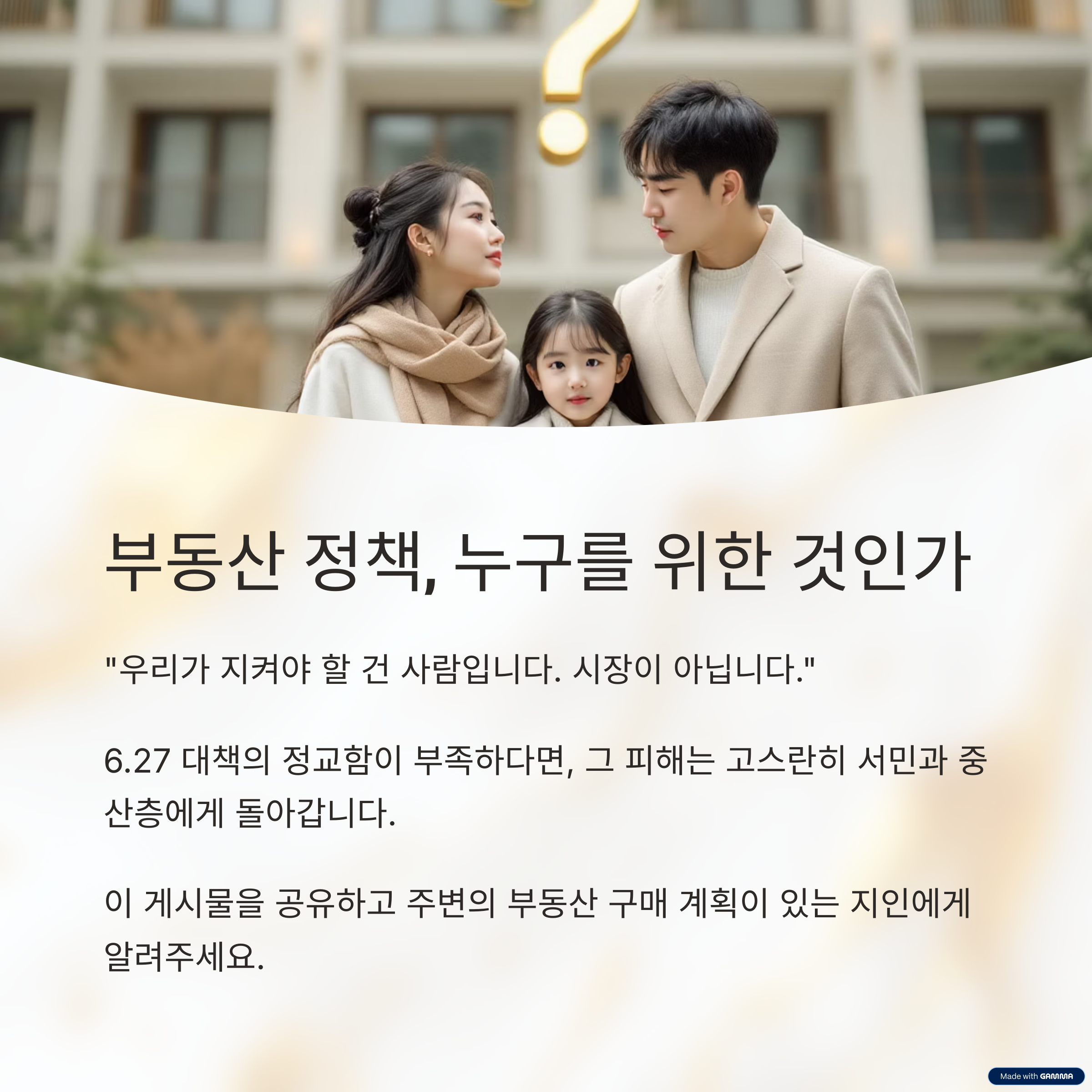 이번 6.27 대책은 분명 시장 안정화를 위한 시도입니다. 하지만 그 칼날이 무주택 실수요자의 일상까지 파고들고 있다면, 지금이야말로 정책의 정교한 조율이 필요합니다.