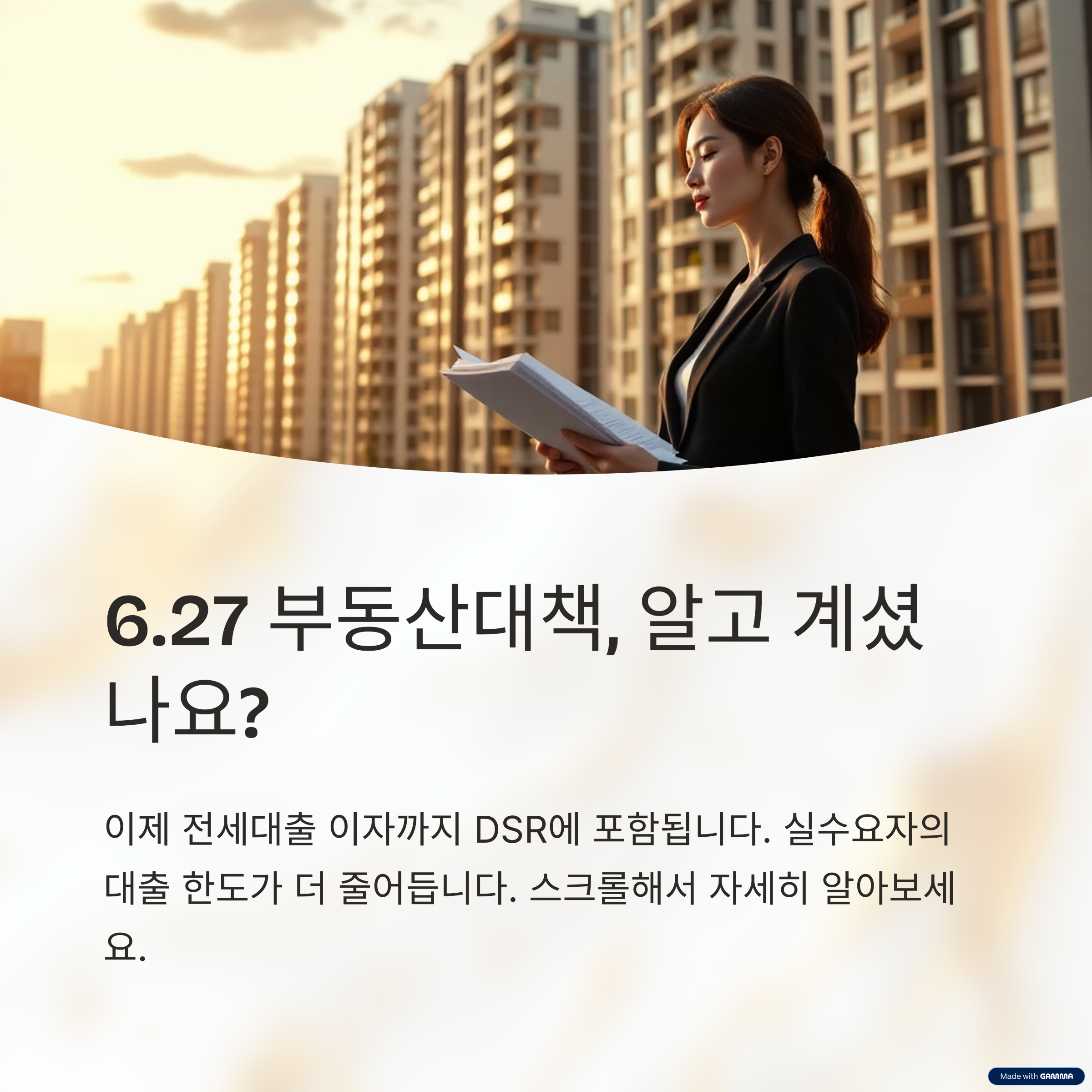 최근 발표된 6.27 부동산대책은 대출 규제 강화라는 키워드로 시장의 큰 주목을 받고 있습니다. 특히 전세대출 이자까지 DSR에 포함시키겠다는 조치는 실수요자들에게도 직격탄이 될 수 있어 논란이 되고 있습니다. 이번 글에서는 왜 이런 규제가 나왔는지, 현장에서는 어떤 반응이 있는지, 앞으로의 주거 전략은 어떻게 세워야 할지를 상세히 알아보겠습니다.