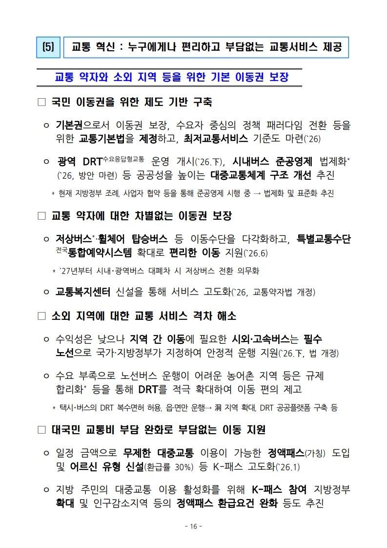 - 교통약자 배려: 시골에는 부르면 오는 '똑버스(DRT)'를 확대하고, 저상버스를 늘려 휠체어 사용자도 편하게 이동할 수 있게 합니다.