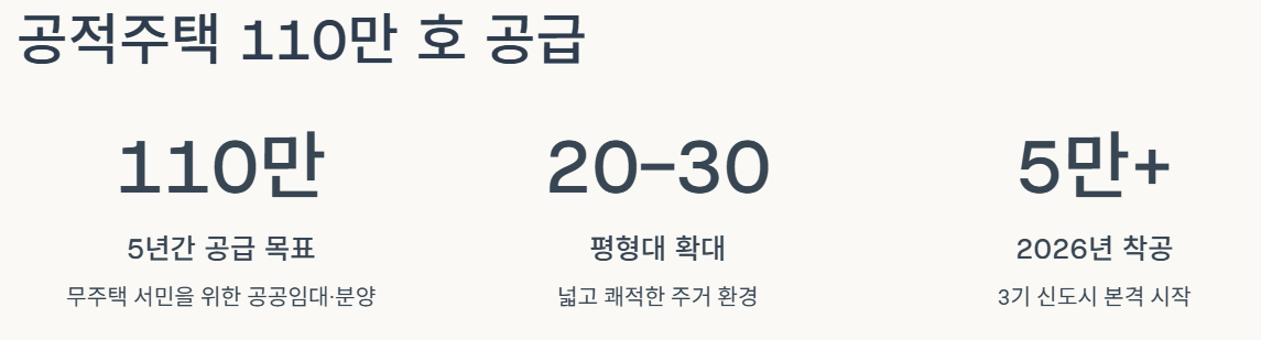 - 공적주택 110만 호: 5년 동안 무주택 서민을 위해 110만 호의 공공임대 및 공공분양 주택을 공급합니다. 좁고 낡은 임대주택이 아닌, 평수를 넓히고(20~30평대) 살기 좋은 곳에 짓습니다.