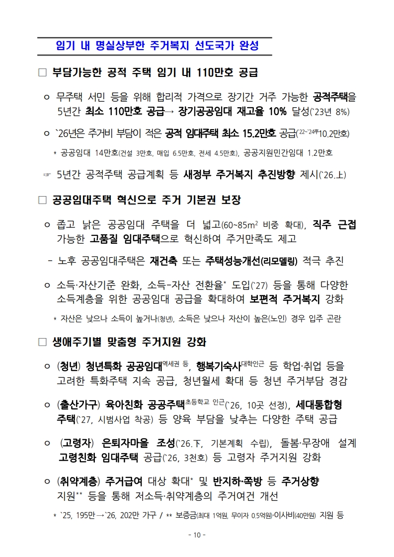 - 주거안정: 집값 걱정 없이 누구나 안심하고 사는 나라