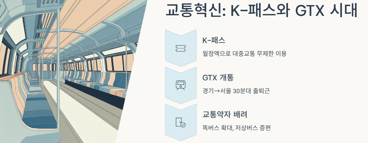 - K-패스 도입: 월 일정 금액으로 대중교통을 무제한(또는 환급) 이용할 수 있는 패스를 도입해 교통비 부담을 확 줄입니다.