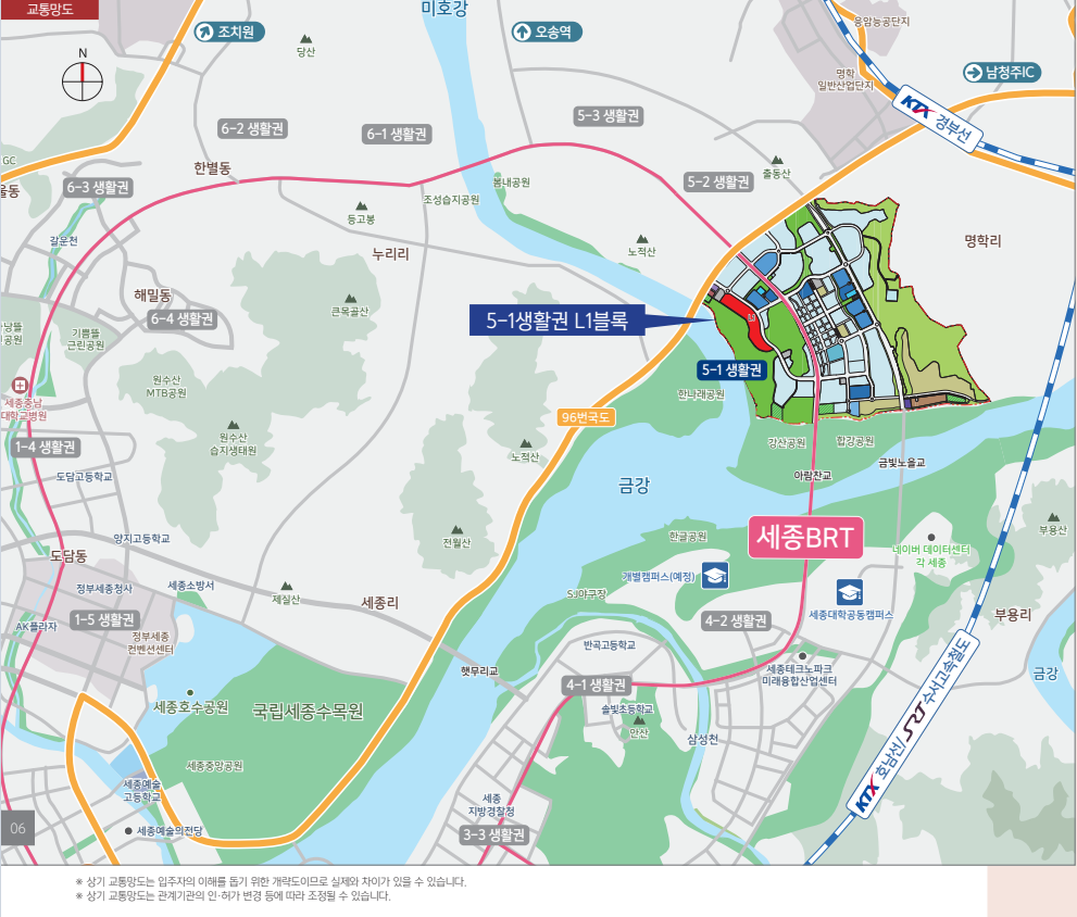 - 사통팔달 교통의 요지: 단지 인근을 지나는 BRT(간선급행버스) 노선은 세종시 내부 이동은 물론, 인근 오송역(KTX/SRT)과의 연결성을 극대화합니다. 또한 외곽순환도로와 인접해 있어 청주, 대전 등 인근 도시로의 광역 교통망이 매우 우수합니다.
